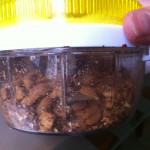 1. I have no experience with using a hand-cranked food processor, but my understanding of creating a smooth butter from nuts as opposed to a more stiff one as you seem to have produced here has to do with the speed at which the blades move–faster speeds allow more of the oils inside the nut to escape, yielding a smoother, creamier texture. It might be difficult to reach the necessary speed by hand, so perhaps an automated food processor might be worth it if you are so inclined. Then again, that’s less of a forearm workout.