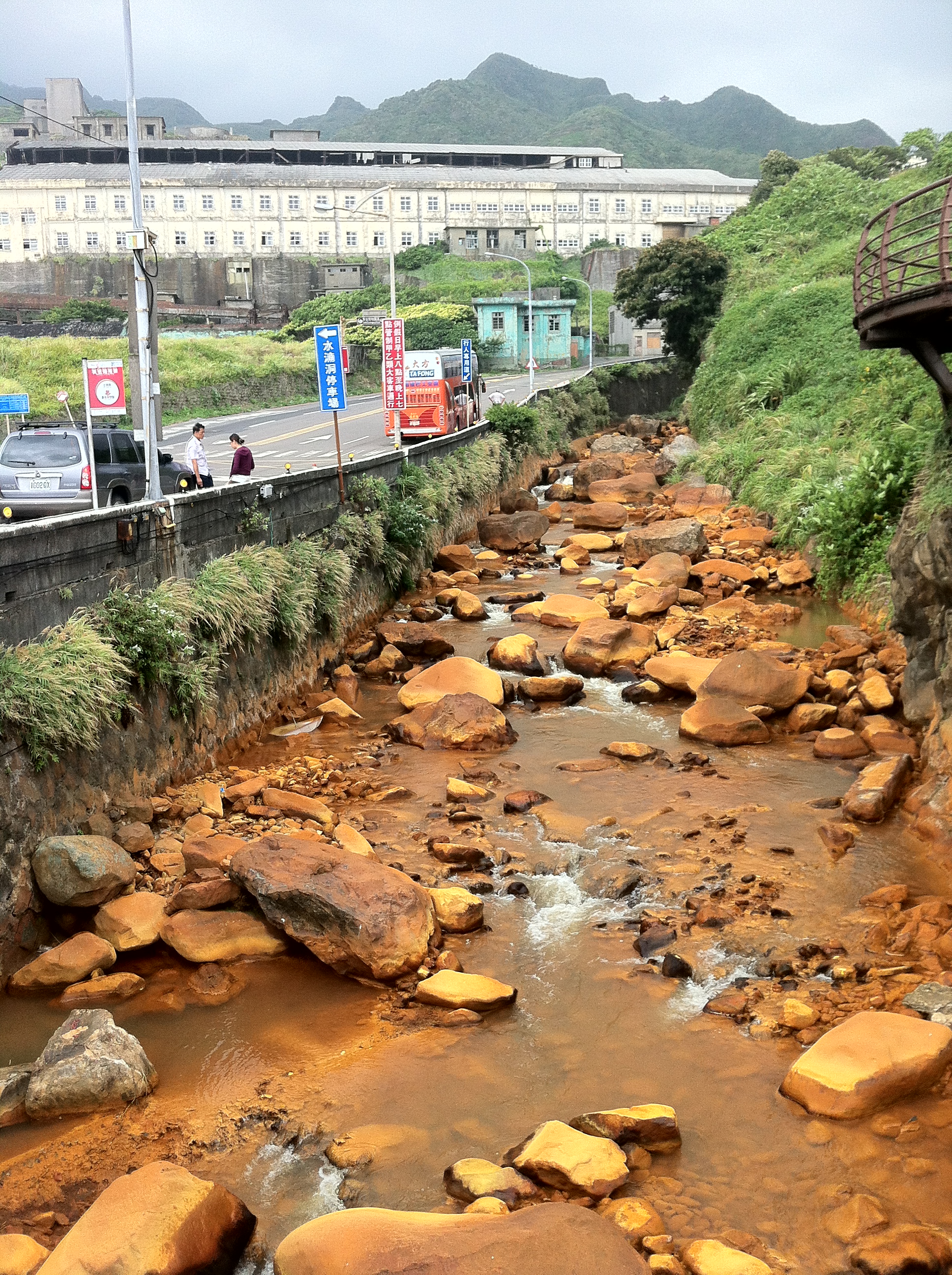 Jiufen is a small town perched atop beautiful mountains that rise right next to the coast. There was once a mining boom, which still influences the area. One of the most obvious influences that we had a chance to stop and observe was a tributary carrying acid mine drainage out to the ocean. The plume of water is so low in pH (1-2) that iron compounds are soluble. When the water begins to mix with the ocean and the pH is raised, the iron precipitates, and appears as a dark red-brown plume. This makes it easy to see how the plume’s length and characteristics vary based on the tides.