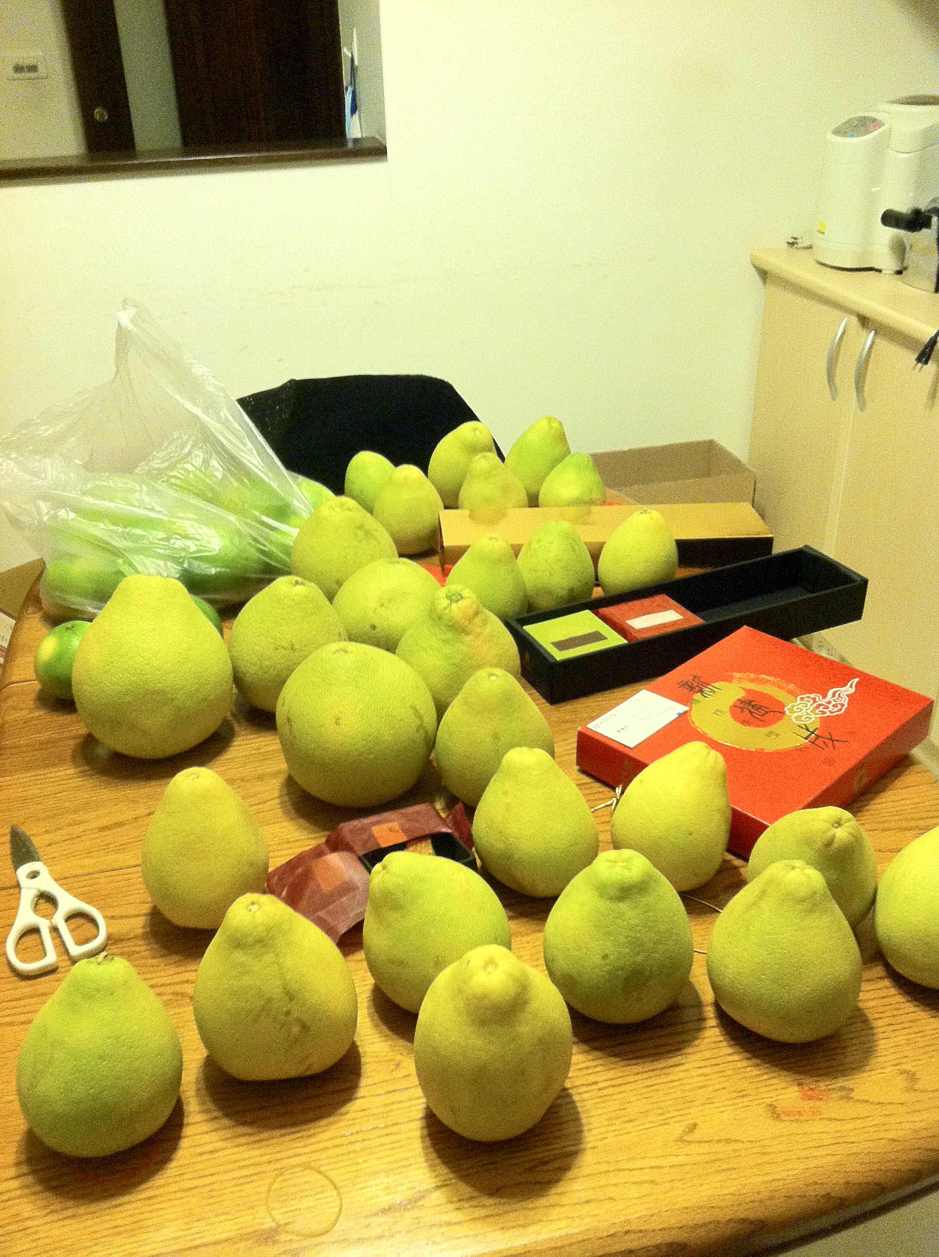 It’s fall; it’s Autumn Festival (中秋節). Moon cakes pile up in peoples’ houses as they gift them to their friends, their families, their bosses, and of course, foreigners that they think need to know about Taiwanese traditions. It’s also time to eat pomelos (文旦, or 柚子). Unlike last year, I know how to eat them and am confidently ripping the thick rind and the tough membranes off, familiar with the way that the skins cause a little tingling numbness as they touch lips and tongue.